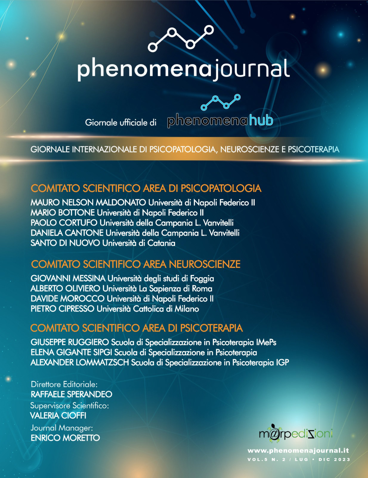 Phenomena Journal is a six-monthly journal written in double-blind peer review aimed at experts in the fields of Psychopathology, Neuroscience and Psychotherapy. The journal aims to publish articles, reviews, methodological study hypotheses, opinion articles, produced by names of the national and international panorama of the sectors of interest of the magazine. In addition, the newspaper aims to spread scientific culture in sectors that are not exclusively academic, such as clinical areas not specialized in research projects. The newspaper, run by the Phenomena research group, published by Marp Edizioni, offers editorial support through a flexible and available way for all those who want to get closer to the world of Scientific Research. The articles are available at www.phenomenajournal.it and are covered by an Open Access license.